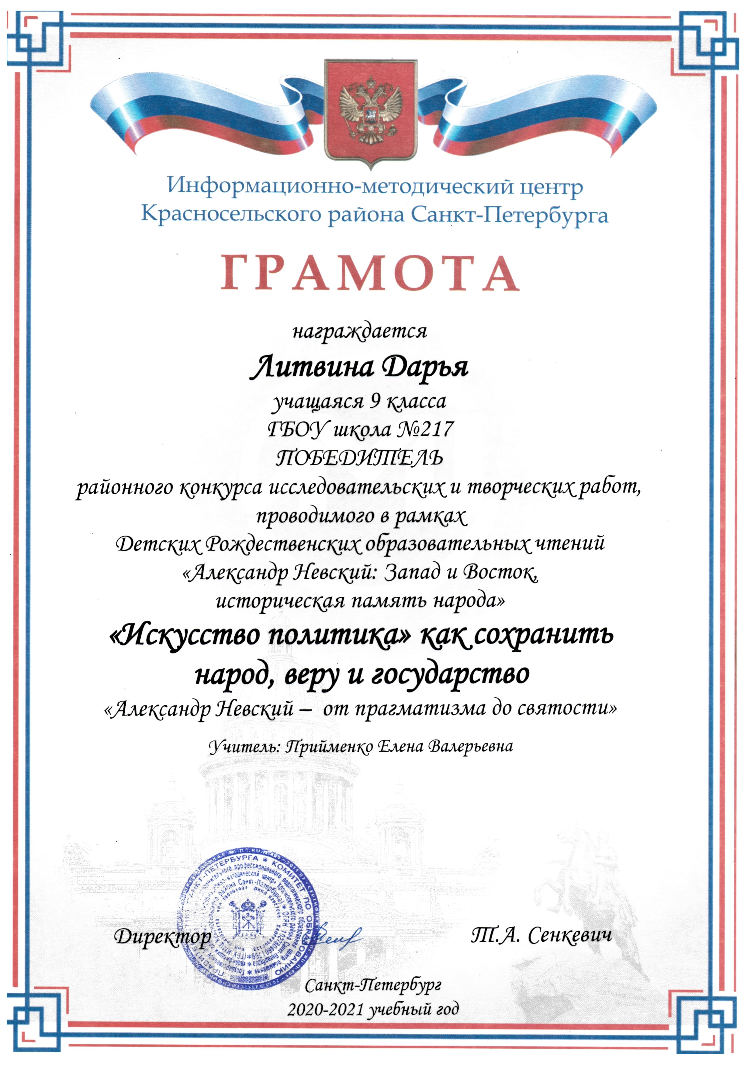 Литвину Дарью, руководитель Прийменко Е.В.